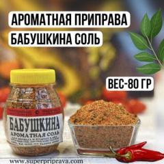 Описание: «БАБУШКИНА СОЛЬ» — это ароматная и очень вкусная смесь пяти разных приправ: адыгейской, сванской, чесночной, ореховой и грузинской соли. В основу добавлен чеснок, зелень, орехи, свежий перчик и Грузинская приправа. Сама приправа по вкусу не острая. Ей можно заправлять первые, мясные, рыбные, овощные блюда. Идеально подходит для маринадов и супов.